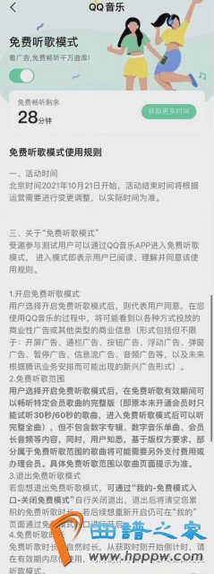 截图显示,每看一次广告可以免费获得30分钟听歌时长,用户同意开启该模式后,应用会在开屏、通栏等多个位置投放广告。