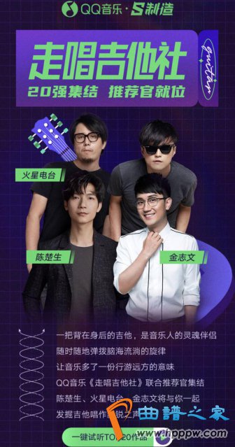 20位吉他唱作新锐集结,打开吉他创作的N种可能!7月16日,“走唱吉他社”创作大赛20强新鲜出炉,为乐迷带来高质量吉他新声。更特邀金志文、陈楚生、火星电台3位重量级专业评委担任“联合推荐官”,与大众乐迷共同挖掘最有潜力的新锐之声,为大众带来最优质的吉他原创作品。