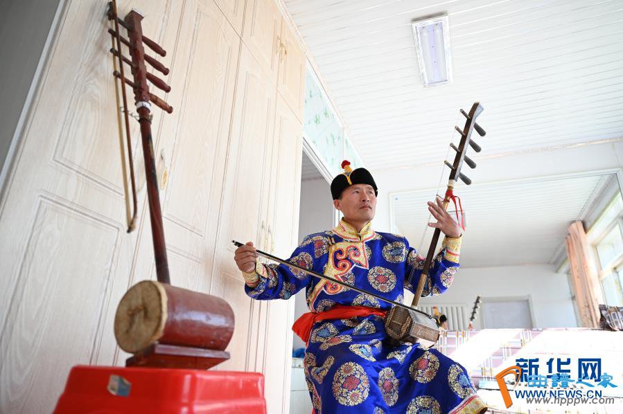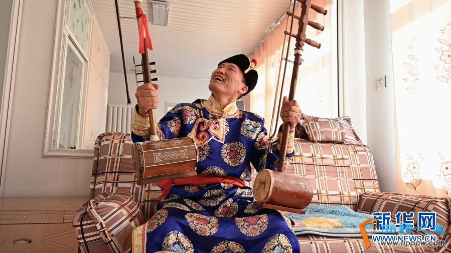 内蒙古自治区通辽市开鲁县脱贫户包莲在弹奏四弦胡琴(2月22日摄)。新华社记者 贺书琛 摄
