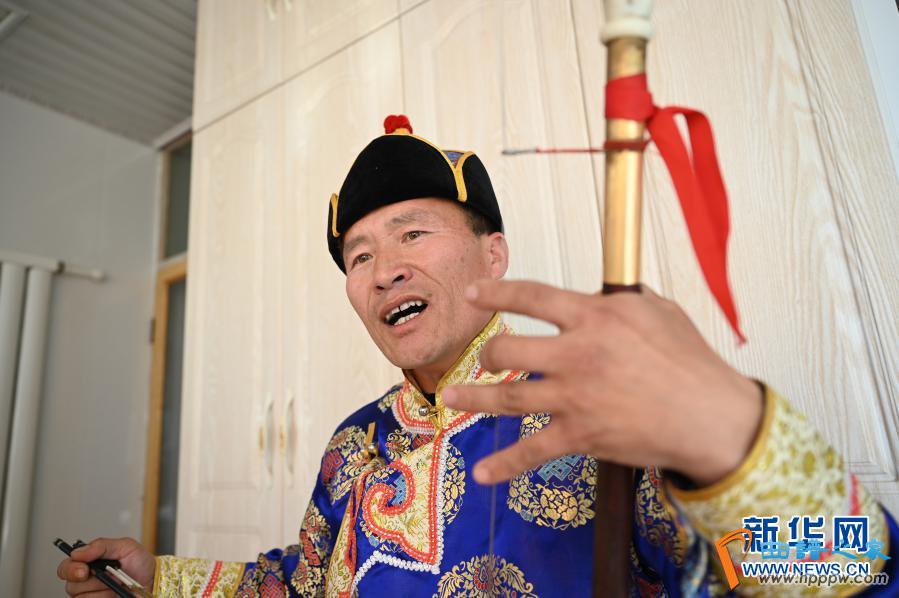内蒙古自治区通辽市开鲁县脱贫户包莲在表演蒙古族说唱(2月22日摄)。新华社记者 贺书琛 摄