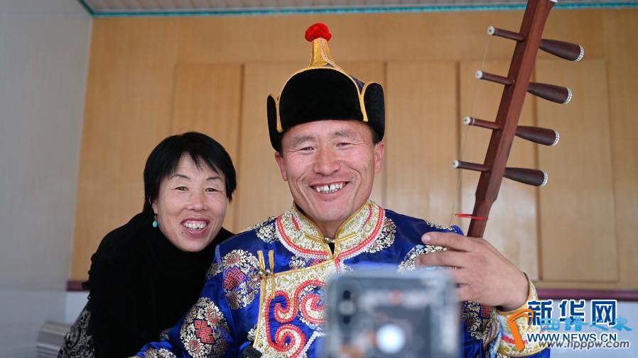 内蒙古自治区通辽市开鲁县脱贫户包莲在直播弹奏四弦胡琴(2月22日摄)。新华社记者 贺书琛 摄