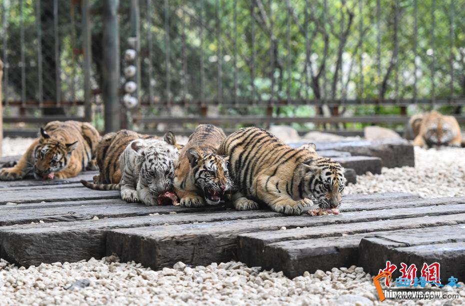 10月17日,小老虎匍匐前进抢食。当日,济南野生动物世界2017年诞生的12只小老虎集中亮相,霸气模样吸引许多游客驻足观赏。据悉,济南野生动物园2017年共繁育成活26只小老虎,其中2只是“虎中极品”金虎。 中新社记者 张勇 摄