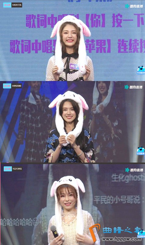 女神开趴除了音乐,最重要的当然是造型!立志为网友“谋福利”的节目组特地为三位青春女神准备了最流行最时尚的兔耳头饰,戴上瞬间萌萌哒,果然女神平时在直播间里没见过的样子《酷狗哆来咪》全都有~在《小苹果》《猪之歌》《普通Disco》等单曲的魔性旋律下,桃子酱、一贰、锦雯还轮流挑战听歌曲关键词捏兔耳朵,可爱女神之后紧跟着清纯女神又紧跟着俏皮女神,超级颜值暴击不停歇,这才是真正的视听盛宴吧!