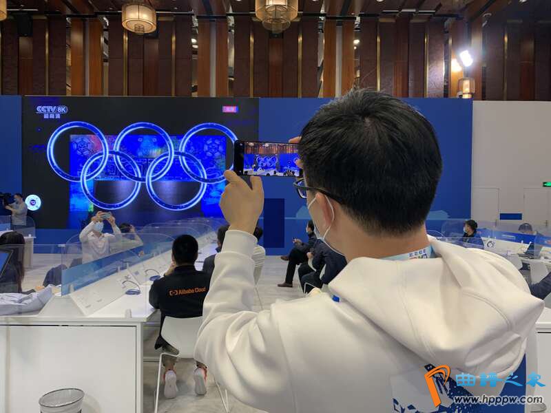 在2月4日晚间的北京冬奥会开幕式,这一首首令人耳熟能详的旋律不仅恰如其分地烘托了现场的氛围,更让屏幕前的全球观众感受到了五线谱中的冰雪奇缘。图为一位记者在2022北京新闻中心拍摄。中青报·中青网记者 许亚杰/摄