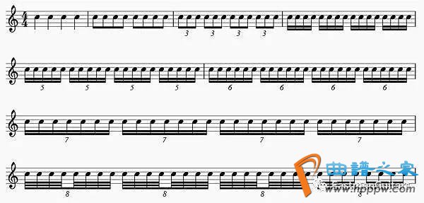 →五连音(一拍5个音)→六连音(一拍6个音)→七连音(一拍7个音)→32分音符(一拍8个音)。