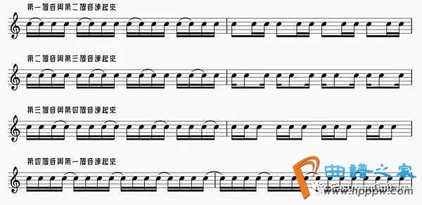 接下来你可以练习这些切分的组合,比方说四连音好了,我们可以练习把其中两个相邻的音用连音线连起来: