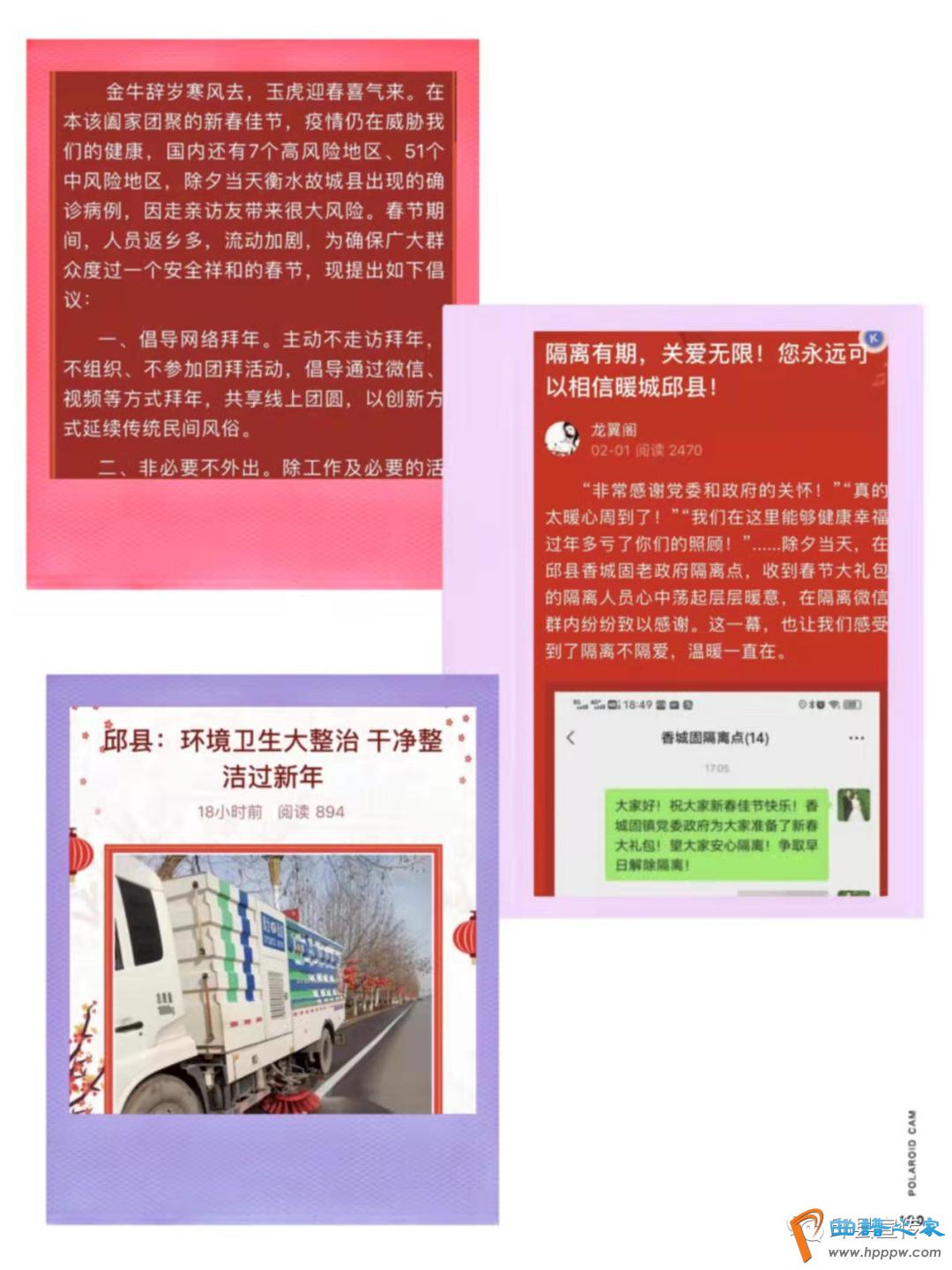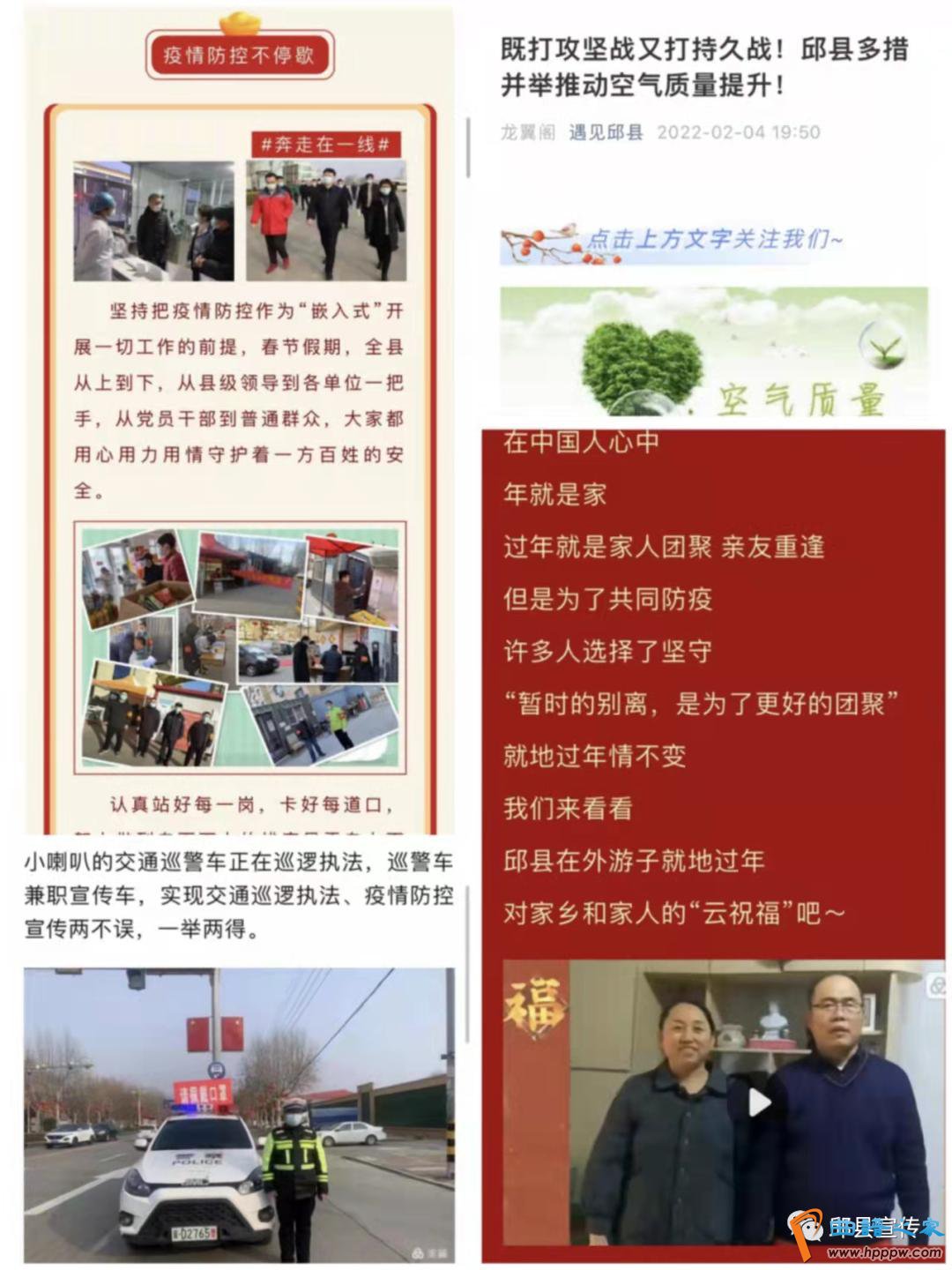 电话采访、深入实地、整理资料……新闻工作者们围绕春节期间民生热点、县域重点工作、疫情防控等每天精心推出春节期间系列报道。通过微信公众号,美篇等形式先后推出《就地过年情不变!邱县在外游子“云拜年”》《邱县硬核小喇叭喊出疫情防控“最强音”》《隔离有期,关爱无限!您永远可以相信邱县这座暖城》《邱县环境卫生大整治 干净整洁过新年》《春节不停歇 一线不打烊丨邱县假期稳步推进各项重点工作》《既打攻坚战又打持久战!邱县多措并举推动空气质量提升!》等报道,生动展示了邱县春节期间广大群众的温暖情怀和全县党员干部奋战一线踔厉奋发的良好精神面貌。