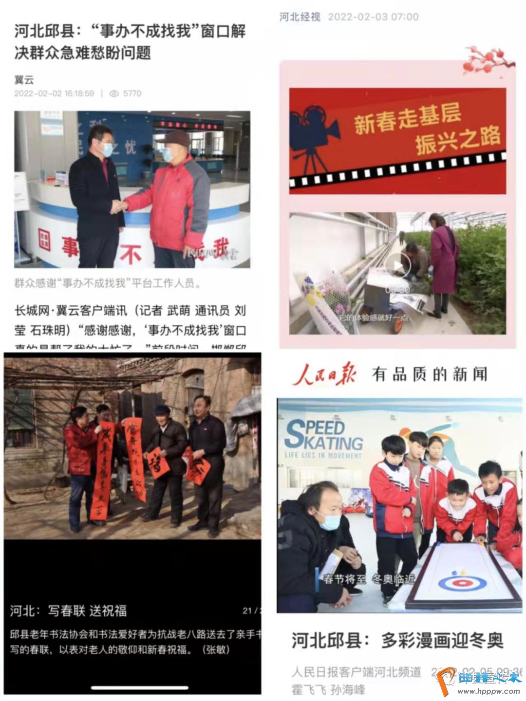 在做好县内宣传的同时,持续做好外宣工作。2月2日,长城网以《河北邱县:“事办不成找我”窗口解决群众急难愁盼问题》为题,报道了邱县纪委监委牵头设立了“事办不成找我”窗口,通过领导干部值班,开通两部服务热线和电子邮箱,进一步畅通群众投诉反映渠道的亮点经验做法。2月3日,河北广播电视台经济生活频道今日资讯栏目播出《新春走基层邯郸邱县:土路升级变身观光路 出行便利助力产业兴》内容。2月5日,人民日报客户端先后刊发题为《河北:写春联 送祝福》的图片新闻,报道了我县文联组织当地书法爱好者走进香城固镇刘云固村,为村民们现场书写春联,赠送新春祝福,邱县老年书法协会和书法爱好者为抗战老八路送去了亲手书写的春联,以表对老人的敬仰和新春祝福。以《河北邱县:多彩漫画迎冬奥》为题刊发短视频新闻,报道了邱县农民漫画家以漫画的形式表达对冬奥祝福的亮点做法。