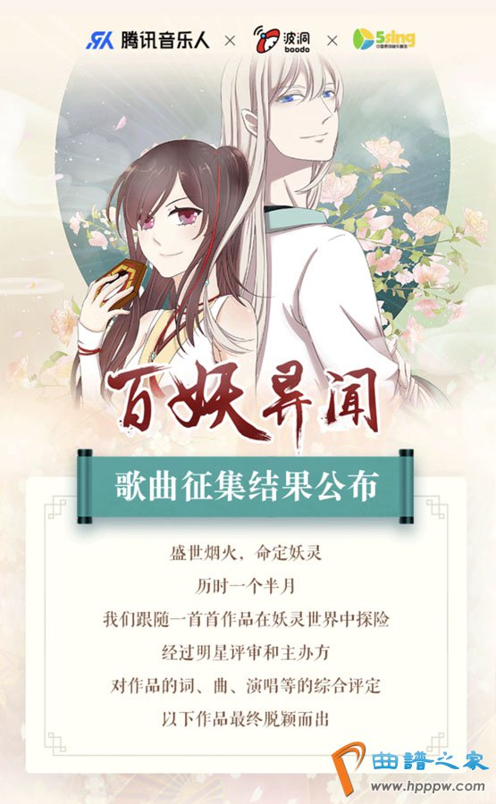 《百妖异闻》是2018年QQ动漫独家推出的全新原创国漫,这部作品正式上线天,阅读数就破亿,收藏量突破47万,用户口碑爆棚。本次腾讯音乐人联合波洞、5sing为这部现象级漫画共同征集原创歌曲,活动一经推出便吸引了众多原创音乐人的参与。