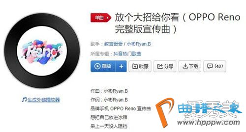 这首歌曲的歌名叫做《放个大招给你看!》,是由永彬RyanB演唱的一首歌曲,是品牌手机 OPPO Reno的宣传曲。《放个大招给你看!》,是抖音非常火的一首歌,很多人都喜欢这首歌,很多网友都有在抖音评论中说到想要知道这首歌的歌名。