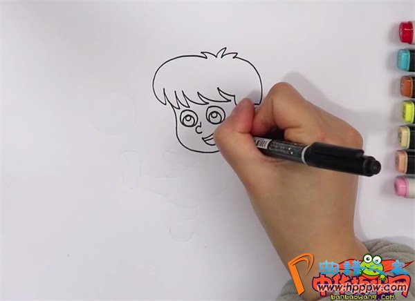 1、首先画出小男孩的头部,画出短发的纹理,脸是侧着的,画出眼睛、鼻子和嘴巴。