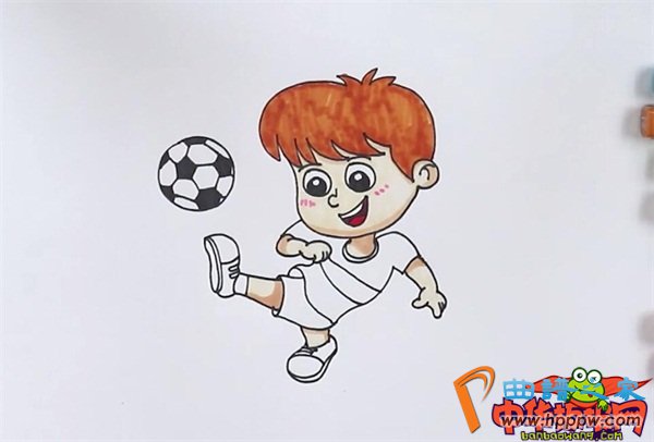 首先画出小男孩的头部,画出五官,接着画身体,穿着条纹短袖,一只脚高高的抬起,在空中画上一个足球,给小男孩的头发涂棕色,皮肤涂肤色,脸颊两边画腮红,上衣涂红蓝条纹,裤子涂蓝色,鞋子涂黄色,体育运动简笔画就完成啦!