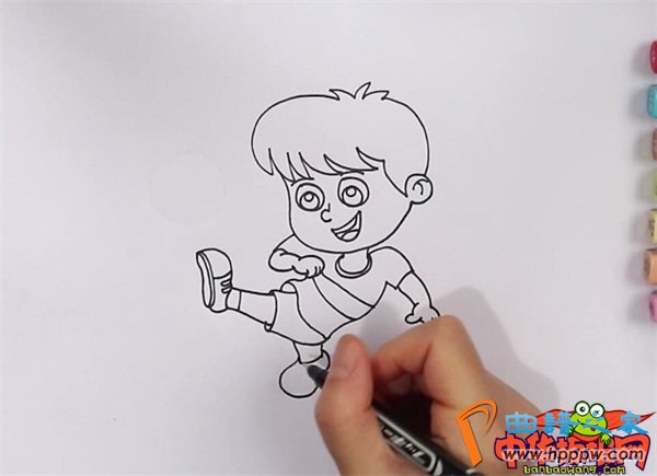 2、接着画出小男孩的身体,穿着条纹短袖,一只脚高高的抬起,正在运动的姿态。