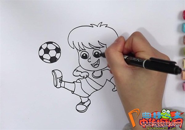 3、在空中画上一个足球,画出足球的纹理,并给部分涂上黑色,小男孩的眼睛也涂黑色。