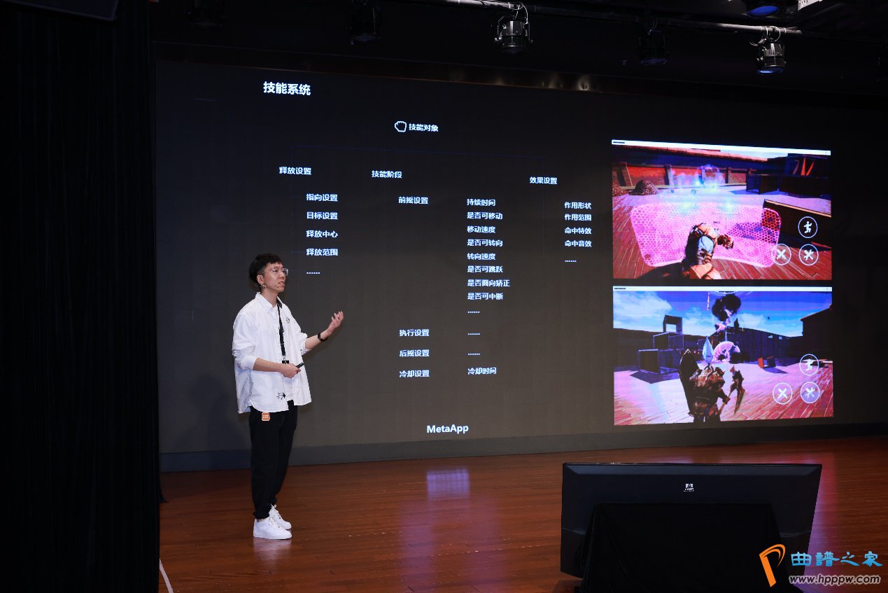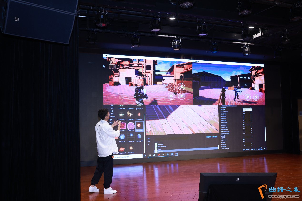 演示会现场,MetaWorld编辑器负责人牛辰通过展示MetaWorld编辑器产出的不同类型游戏demo,播放Showcase游戏实机录制片段视频,让参会者直观了解编辑器的创作效果。