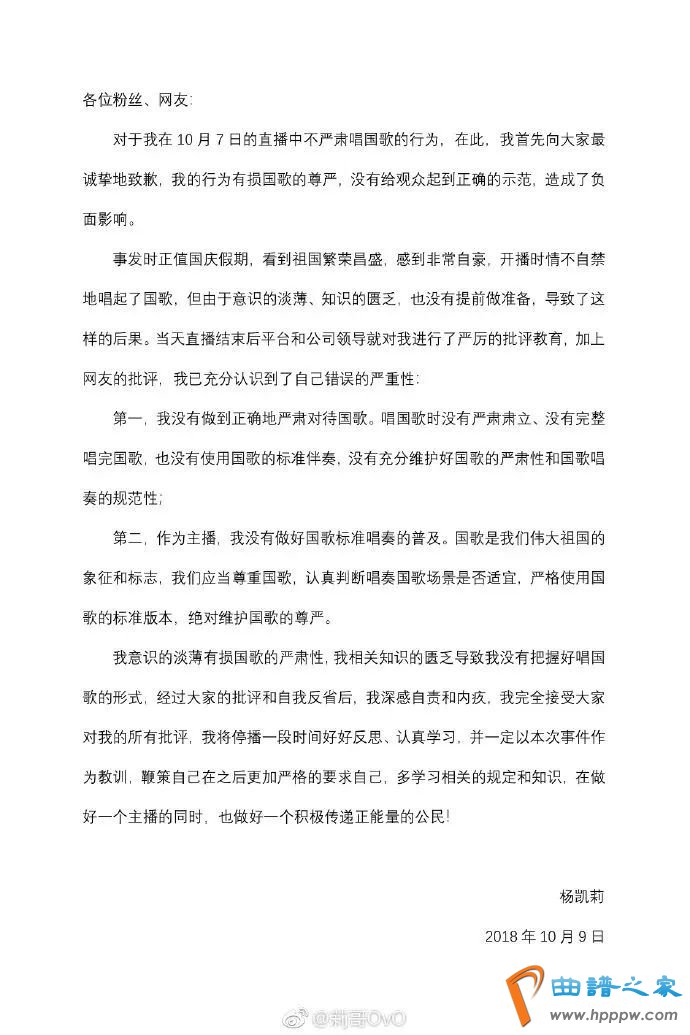 在10日零时许的再次致歉中,她称翻看网友评论时羞愧难当,自己在直播时哼唱国歌的行为“愚蠢低级”,为自己在直播间不严肃唱国歌的行为诚挚道歉,“我的行为深深的伤害了大家的感情:对不起。对不起祖国、对不起粉丝、对不起网友、对不起平台。”