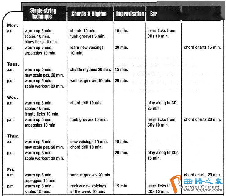 下图为每周练习10小时的时程表范例。请注意在每天的例行练习中并没有包含每一个主题,但每次都是从一个简短的暖手练习开始。这非常重要而且不应该被忽视。这不只是实际上暖手以避免肌肉受伤,而且会让你的手与这些练习「同步」,建立起练习时的准确度。