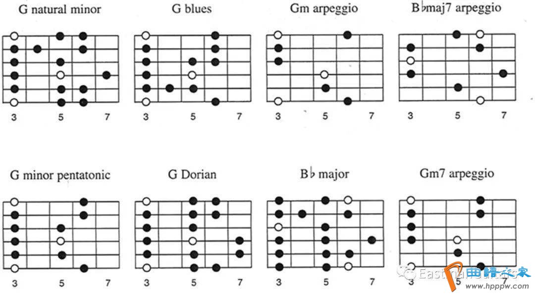 这个方式可以用在任何音阶以及在指板上的任何位置。试着将这个方式应用在下面的音阶或调式中。