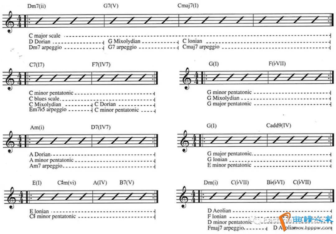 换到Gmaj7 以同样的流程练习大调,然后G7 或G9 练习属调。花点时间,在弹奏自然而然生成、有节奏的乐句以及用固定节拍依顺序弹奏音阶之间反复交替练习是个不错的主意。用固定节拍依顺序弹奏音阶会增加你的耐力,并且会强化你思考的独立性。好的日常练习是每天练习一个调,并且使用各式各样的乐风:摇滚、蓝调shuffle 、12/8、慢歌、放克等等。