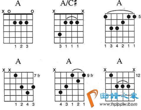 以下是很好的和弦声位练习。将你的节奏鼓设为中板摇滚、放克、或是蓝调shuffle,然后选一个音调。例如,A调。从开放和弦开始,接下来顺着琴颈往高把位,不要停下来。