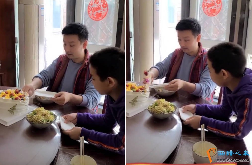 几个简单的素菜,一个奶油蛋糕,简单朴素又不失温馨的氛围,一家人围坐在饭桌前其乐融融的样子,让人觉得挺感人的。