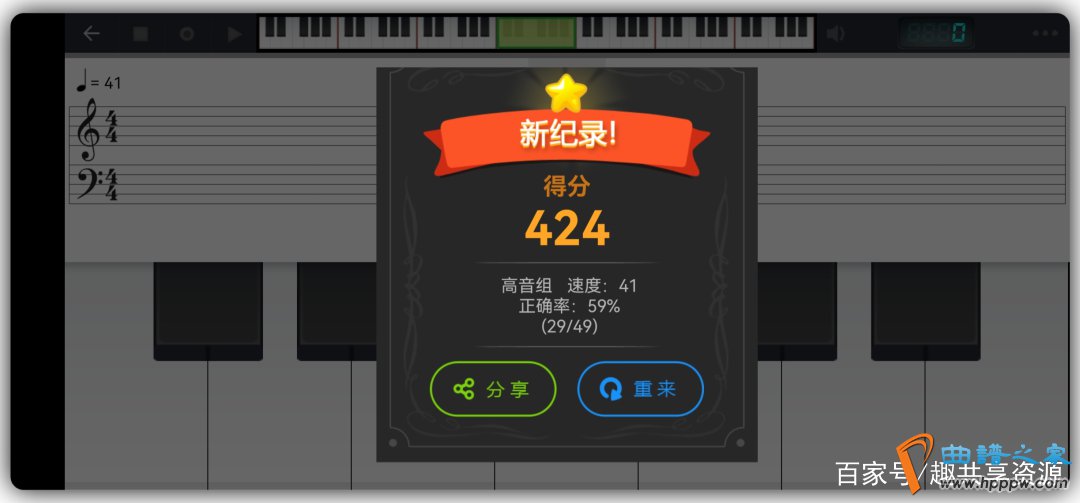 每次练习完,都会有评分、高音组、速度、正确率等数据,帮助你掌握自己的练习结果。
