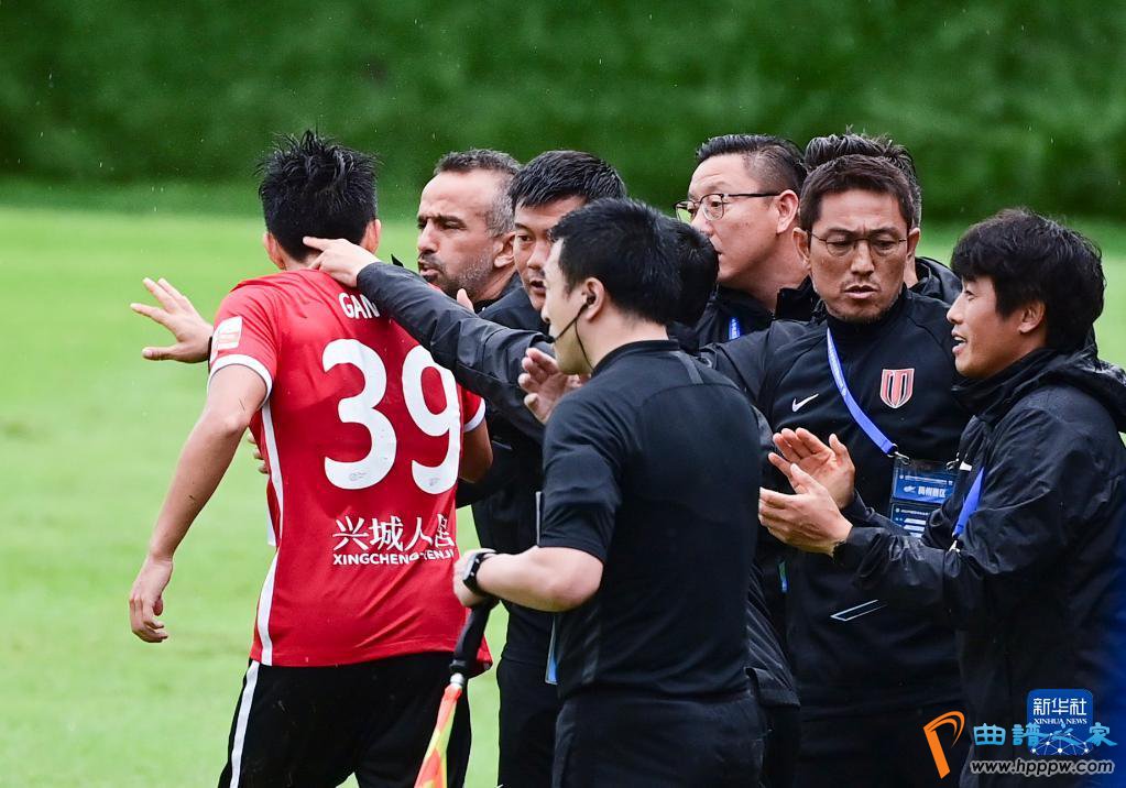 6月16日,成都蓉城队守门员耿晓峰(左一)在比赛中防守。新华社记者 陈欣波 摄