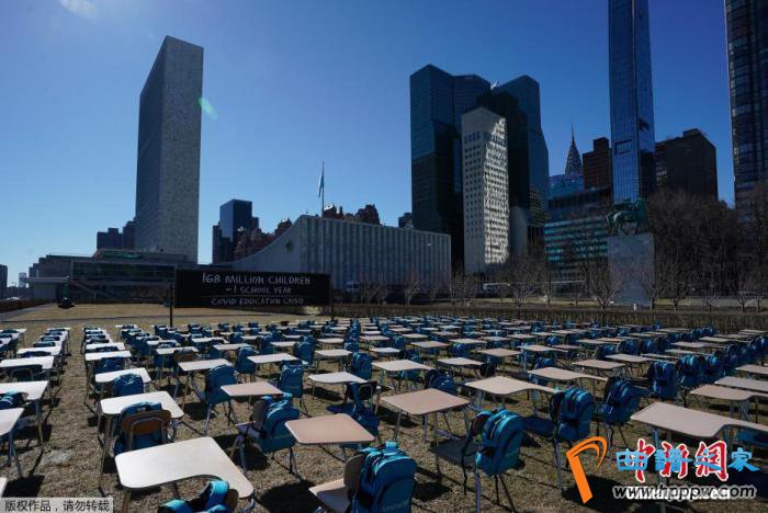 当地时间3月2日,美国纽约联合国总部外,联合国儿童基金会设置了一个“流行病课堂”。其中,每个座位代表100万儿童,这些儿童所在国家的学校已完全关闭近一年。