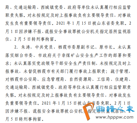 2月23日,山东省应急管理厅发布了该起事故调查报告,共50页、3万余字。原栖霞市委书记姚秀霞、原栖霞市市长朱涛的处理结果一并公布。