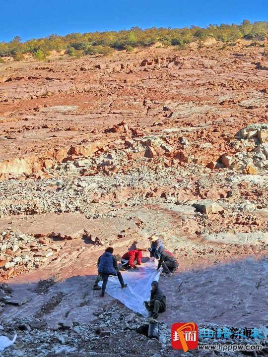 考察学者在为恐龙足迹覆膜描绘轮廓