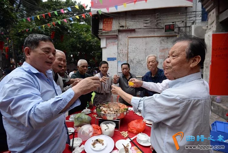 “行乡”结束后,村民们会在古庙广场开斋宴庆祝,大家围桌而聚享用盆菜,其乐融融。据了解,“洪圣诞”已有几百年历史,祈求“洪圣大王”保佑全村一年的风调雨顺。这样的集体活动,往往是全村出动,热闹非凡,也在无形中增强了村民的凝聚力。