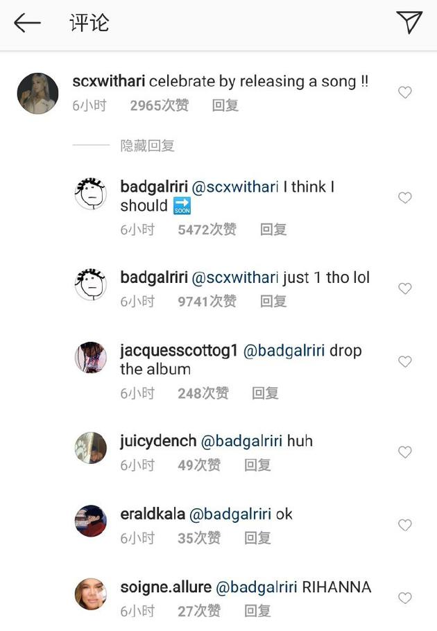 这次是真的?蕾哈娜回复催歌粉丝:只发一首歌