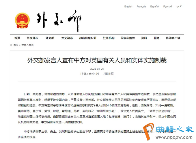 新华社北京3月26日电 外交部发言人26日宣布中方对英国有关人员和实体实施制裁。