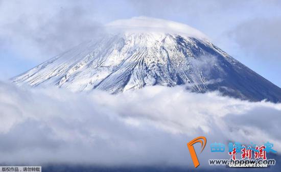 资料图:日本山梨县富士吉田市,富士山顶被积雪覆盖。