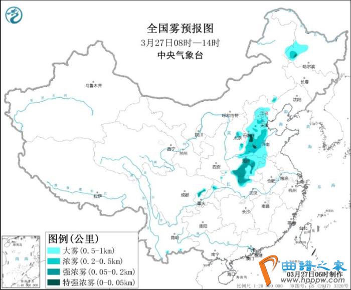全国雾预报图(3月27日08时-27日14时)