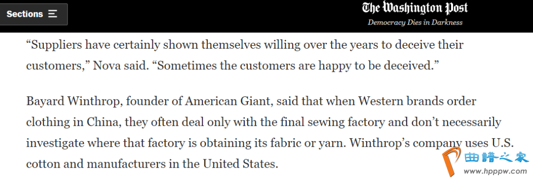 该报采访的一些“劳工组织”的人就称供应商很擅长“欺骗”他们的客户。一家在美国本土生产的服装品牌还称西方品牌一般在中国也不是直接与原材料供应商打交道,所以无法确保原材料没问题,不如直接用他们这个美国本土的服装。