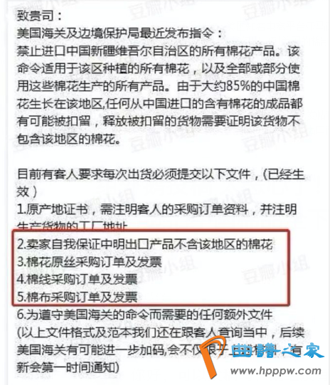 在一份疑似为亚马逊发给中国出口商的文件中,亚马逊表示由于中国有85%的棉花都来自新疆地区,所以有客人要求中国商家必须提供这类证明,否则来自中国的棉制品很可能被美国海关扣下,直到商家能证明棉花并非来自新疆。