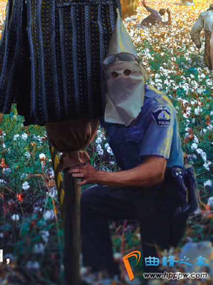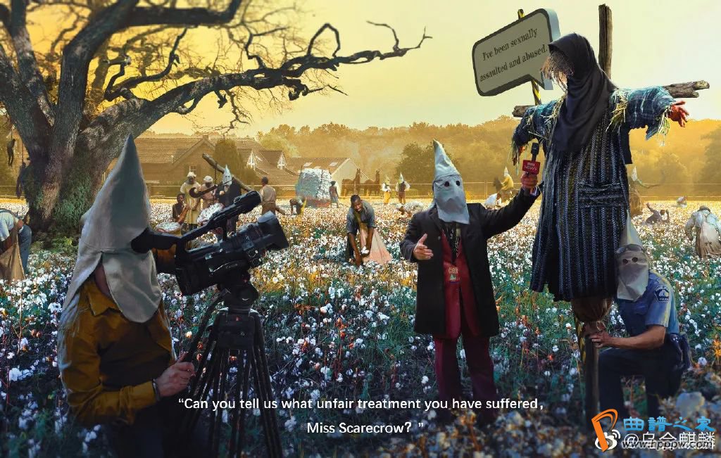 这幅题为——Blood Cotton Initiative (血腥棉花发展计划)的画里,描绘的了一群用白色尖帽蒙脸的记者和警察,在棉花地围着一个稻草人进行采访,而他们身后是正在辛苦采棉的黑奴们。