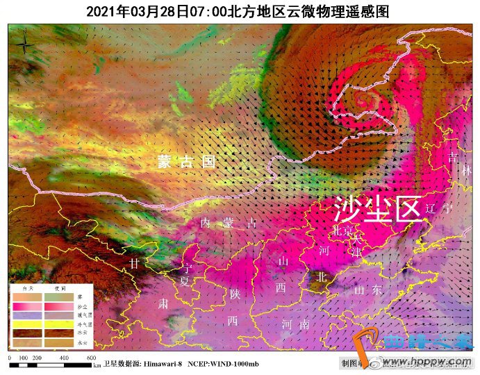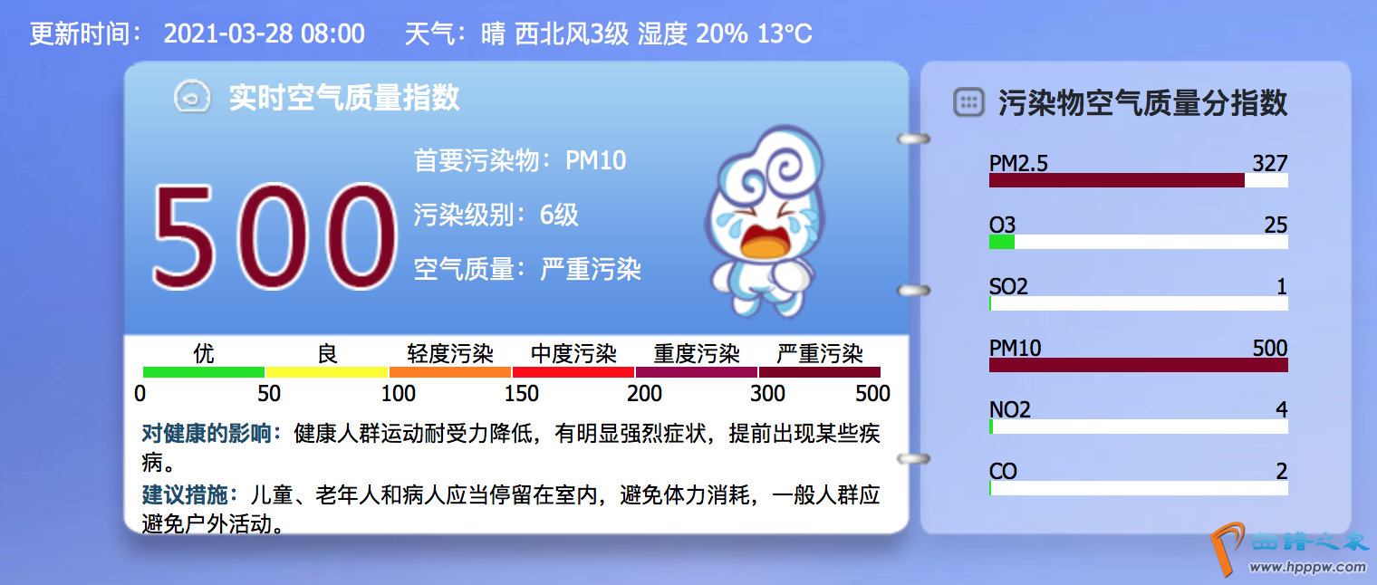 在西北风作用下,28日5时沙尘开始明显影响本市西北区域,7时覆盖全市区域,7时PM10全市浓度均值为2000微克每立方米以上,为6级严重空气污染。