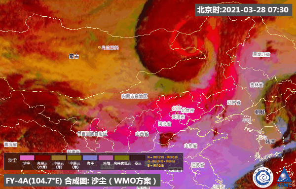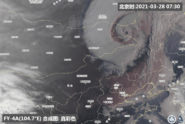 此次沙尘过程强度上虽然不及3月15日那次过程,但也是来势汹汹。风云四号气象卫星实时监测沙尘整个移动过程,只见狂风卷积着沙粒,从内蒙古东北部可以清晰看到气旋云系的螺旋眼区,与气象卫星相互“对视”。