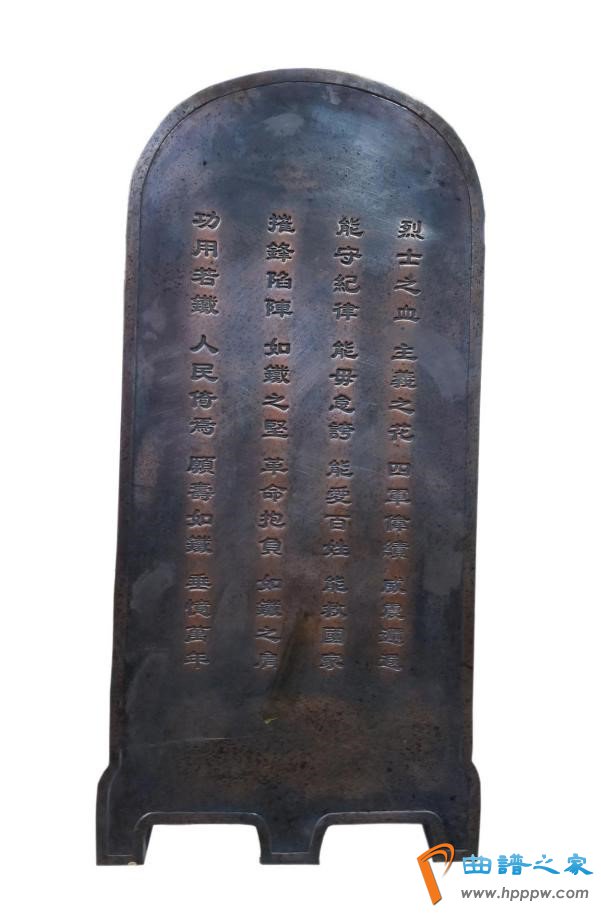 △图为“铁军”盾牌,盾牌高1米,宽0.5米,重达数十斤,正面铸着“铁军”两个大字,用红漆漆过。铁盾牌的上款铸有“国民革命军第四军全体同志伟鉴”,下款是“民国十六年一月十五日武汉粤侨联谊社同人敬赠”。背面铸有四言体词一首: