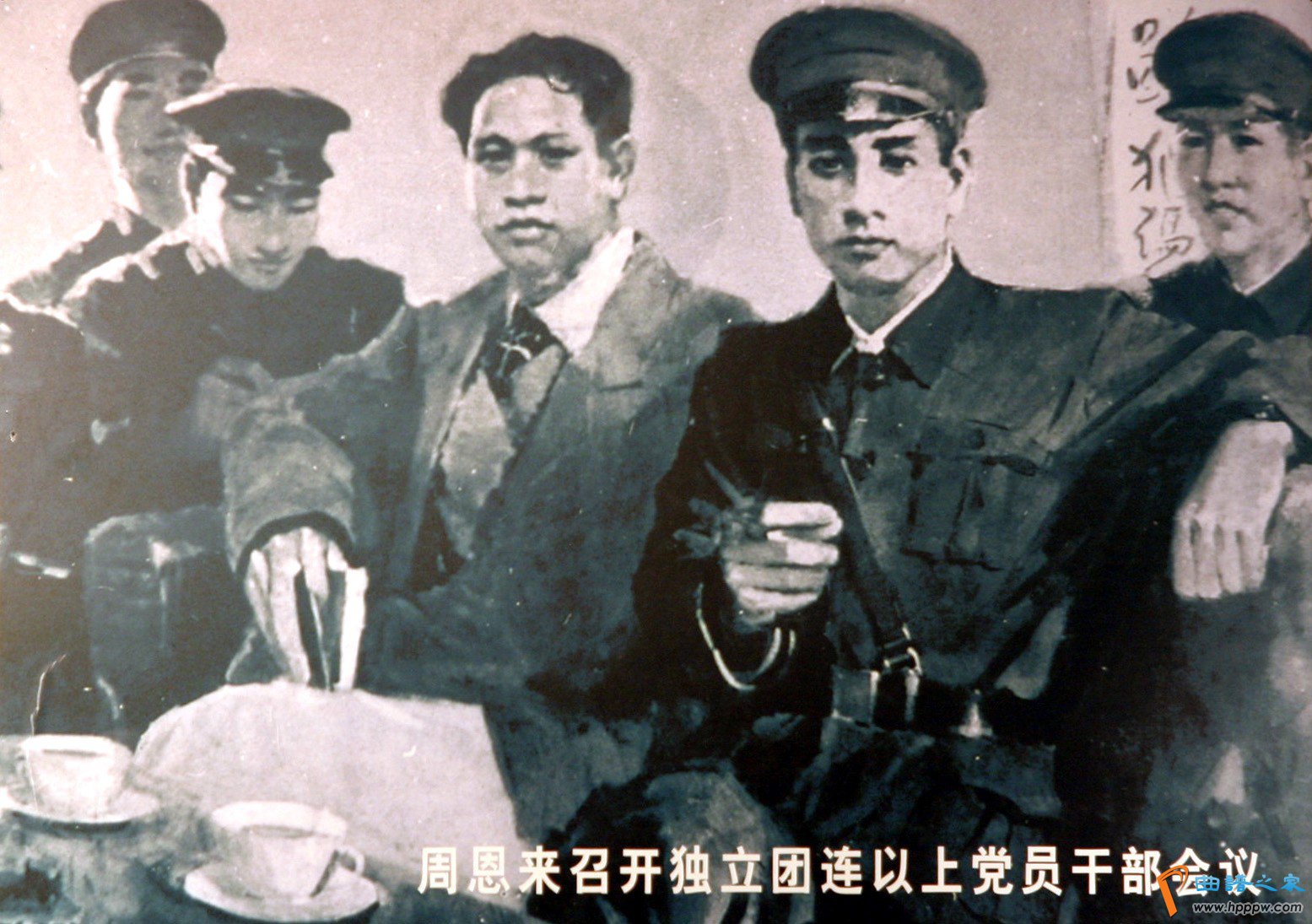 △图为绘画记录周恩来召开独立团连以上党员干部会议。(1926年5月1日,叶挺率领独立团由肇庆、新会出发,在广州集结。周恩来代表中共广东区委,在广州叶家祠召集独立团连以上干部会议,做出重要指示,“要起先锋作用、模范作用、骨干作用;你们的任务很重要,一定要打胜仗”,最后用“饮马长江”激励独立团将士。)