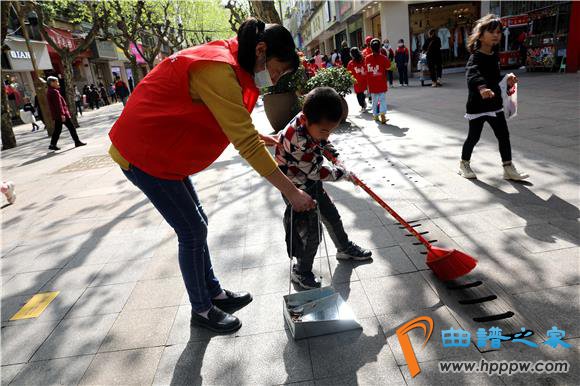 小同学走上街头清扫卫生。特约通讯员 谭显全 摄