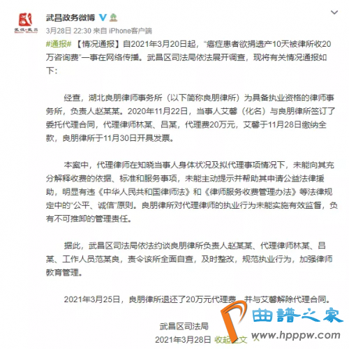 近日有媒体报道,湖北武汉一癌症患者欲捐遗产10天被律所收20万咨询费,事件引发社会关注。3月28日晚,武汉市武昌区官方微博发布通报,称约谈律所相关负责人和代理律师。据悉,律所已退还20万元代理费,并解除相关代理合同。