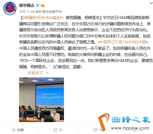 针对近日H&M等品牌抵制新疆棉花问题引发舆论广泛关注,在外交部29日举行的涉疆问题新闻发布会上,新疆维吾尔自治区人民政府新闻发言人徐贵相表示,企业不应把经济行为政治化。针对外部势力以所谓新疆人权问题为借口对中方有关实体和个人实施制裁,包括新疆各族群众在内的中国人民表达了愤慨之情。中国早已不是1840年的中国,中国人民遭受西方列强霸权、霸凌的时代一去不复返了。包括新疆各族人民在内的全体中国人民是不好惹的。制裁的大棒挥向新疆企业的时候,也会砸向自己。“作为一个国际性企业,应该看到这一点。我们希望更多类似H&M的企业,要擦亮眼睛,明辨是非。”