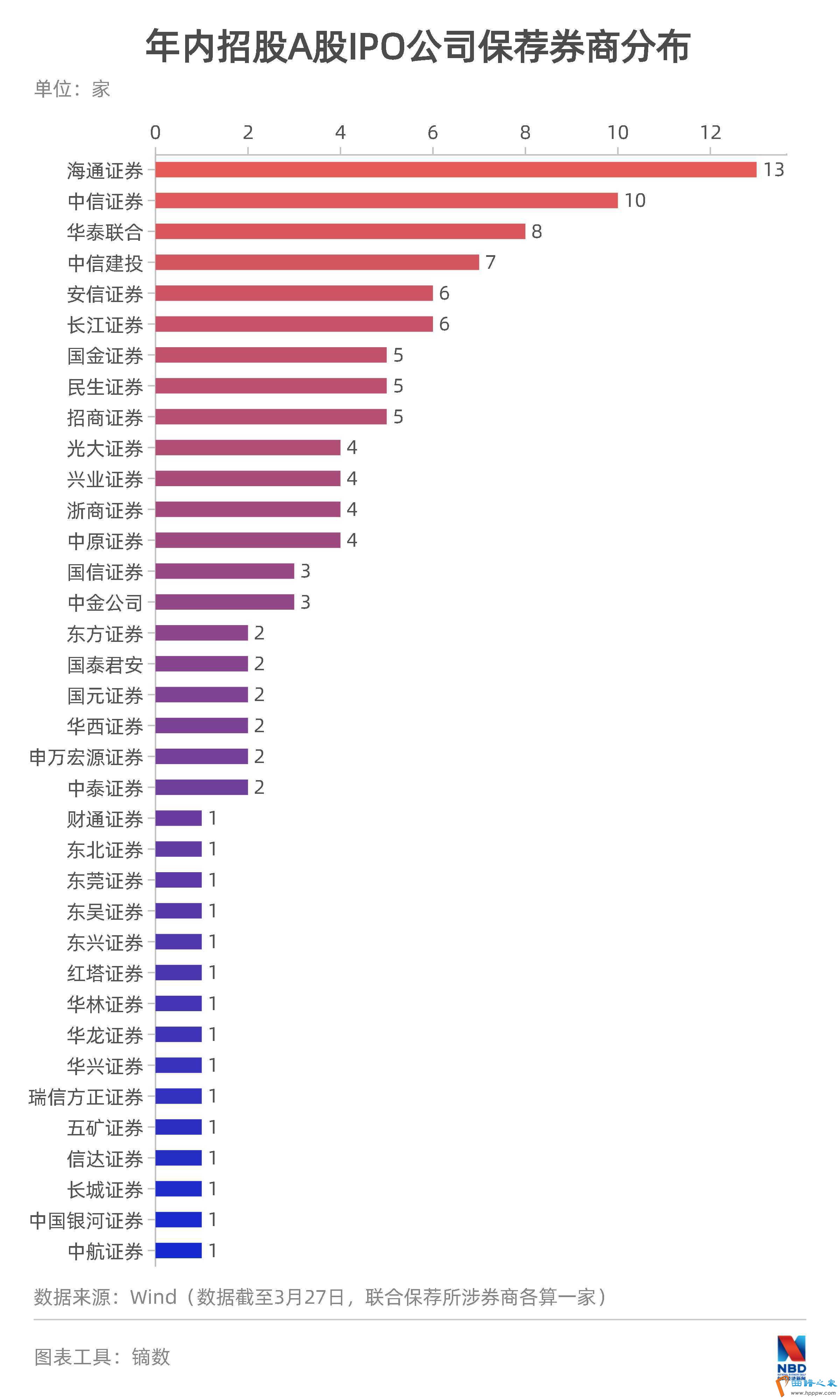 111家年内招股的A股公司中,海通证券独揽13家,雄踞榜首。紧随其后的是中信证券和华泰联合证券,分别为10家和8家。