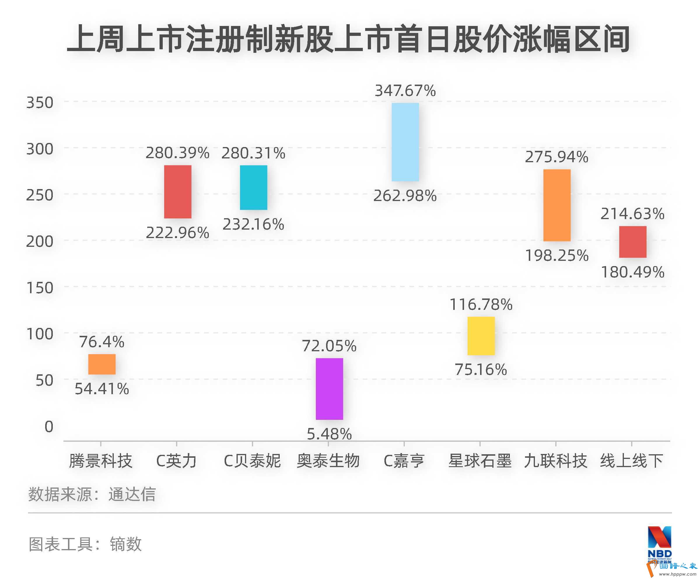 A股上周上市了12只新股,其中多数为注册制。从这些新股上市首日的股价表现看,C嘉亨(300955.SZ)最佳,股价涨幅区间为262.98%~347.67%。