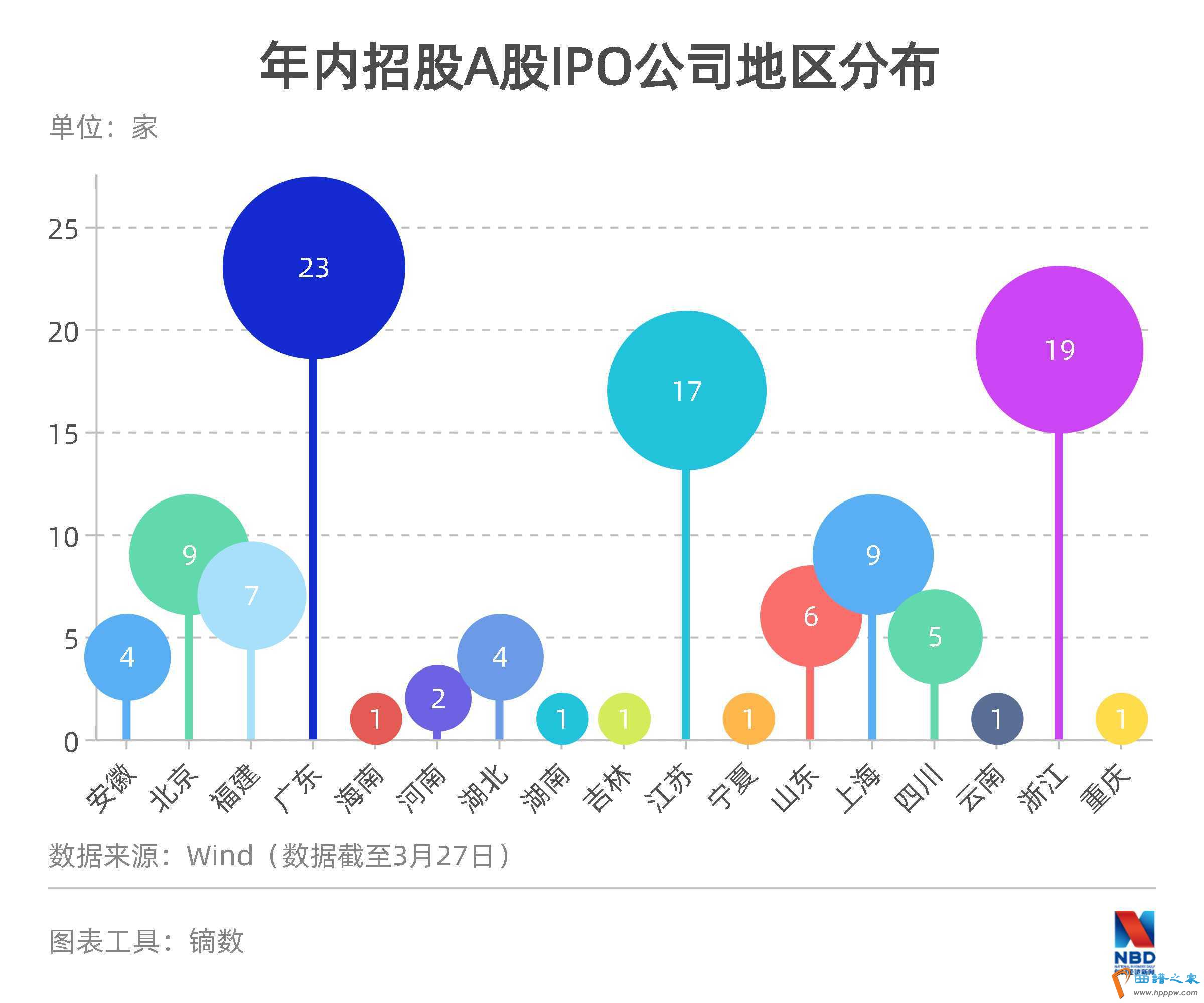 截至3月28日,年内A股已有111家公司完成招股。从地区分布看,广东、浙江、江苏分别以23家、19家和17家名列前三甲,合计占到整体数量半数以上。这三个地方也正好是我国经济比较活跃的地方。