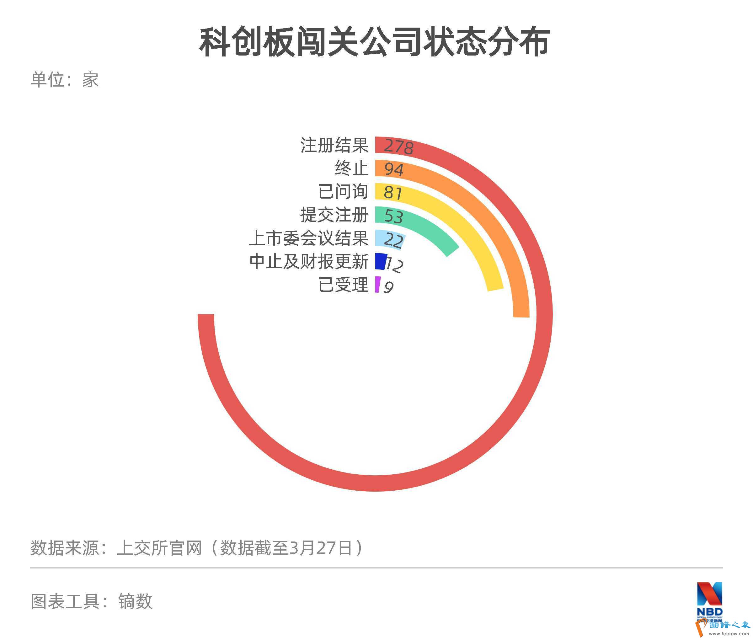 截至3月27日,科创板审核信息披露,全部549家公司中,处于“注册结果”的有278家,紧随其后的是“终止”94家,“已问询”的有81家。