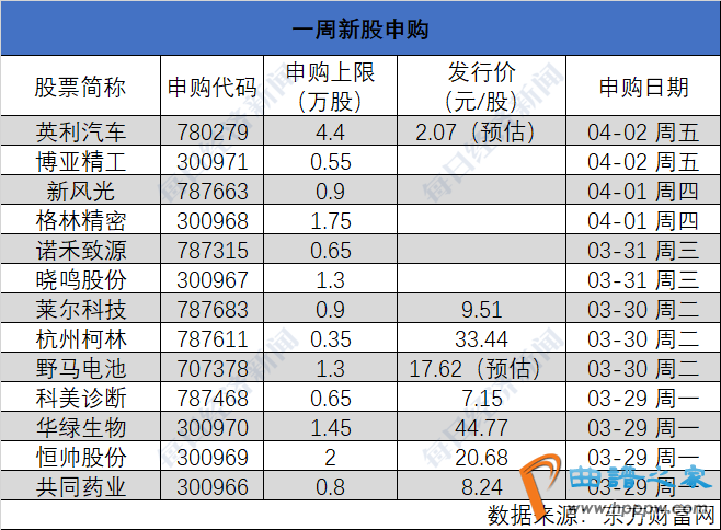 本周(3月29日~4月2日),A股有英利汽车博亚精工等13只个股将迎来申购。《每日经济新闻》记者注意到,华绿生物的发行价高达44.77元/股,或能成为大肉签。而英利汽车预估发行价只有2.07元/股,即使中一签,也赚不来多少钱,只能算是蚊子肉。